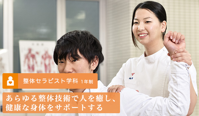 - 筋肉の疲労や、身体のゆがみから生じる不調を、整体技術を用いて整える仕事です。整体・リフレクソロジーなどの技術が得られ、日本セラピスト協会認定の教育機関で学ぶことで認定資格が得られ、卒業後からすぐに活躍できます。手に職をつける目的で、医療分野の国家資格取得者が学ぶことも多くあります。